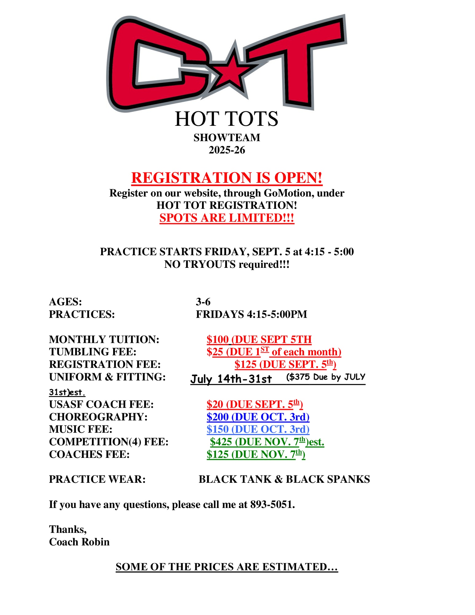 If your little one wants to be a cheerleader, Hot Tots at Cheer Town USA is the place to start! Registration is now open and practices begin Friday September 5th.